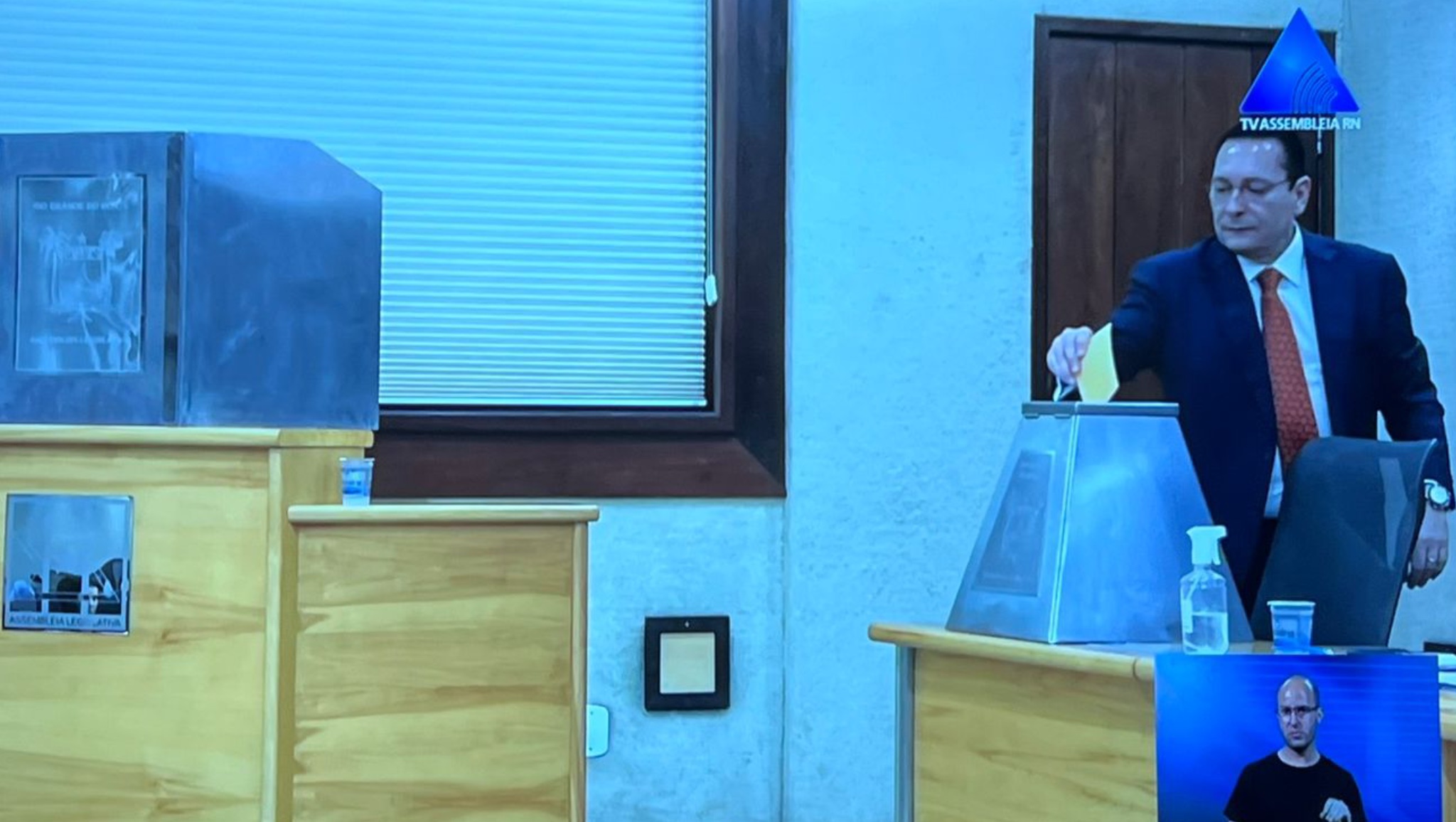 O deputado Ezequiel Ferreira foi reeleito, por unanimidade, presidente da Assembleia Legislativa do Rio Grande do Norte para mais um biênio à frente do parlamento potiguar. A votação ocorreu na manhã desta quarta-feira, 13 de novembro, no Palácio José Augusto, em Natal.