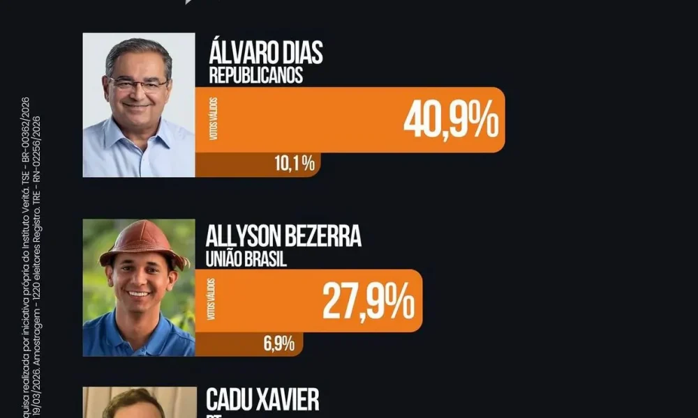 Levantamento do Instituto Veritá também avaliou a lembrança espontânea de voto para o Governo do Rio Grande do Norte. Nesse cenário, Álvaro Dias aparece na...