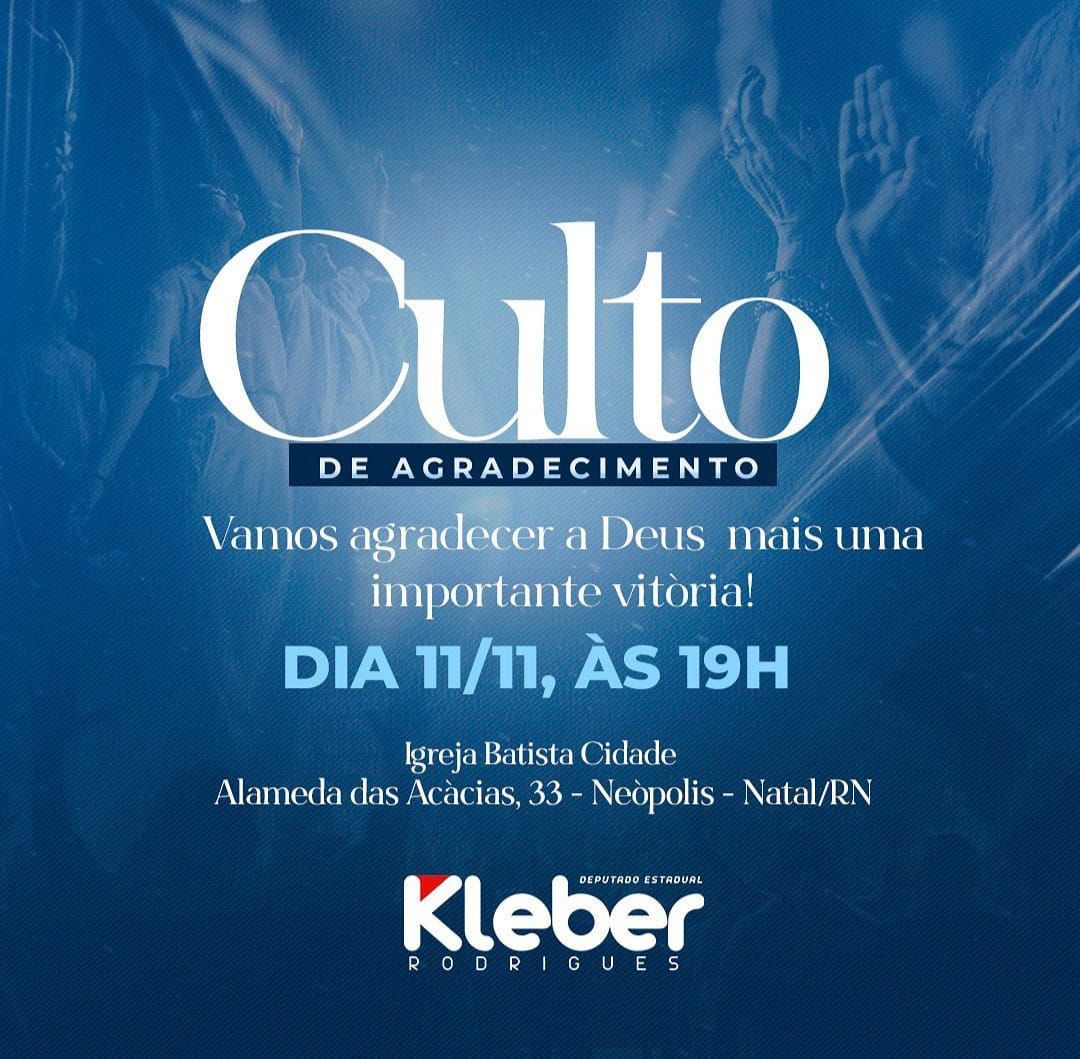 O deputado estadual Kleber Rodrigues(PSDB), reeleito para o segundo mandato na Assembleia Legislativa, fará um culto em ação de graças pela vitória conquistada nas urnas. Será um momento de agradecimento e de religiosidade do parlamentar, amigos e familiares.