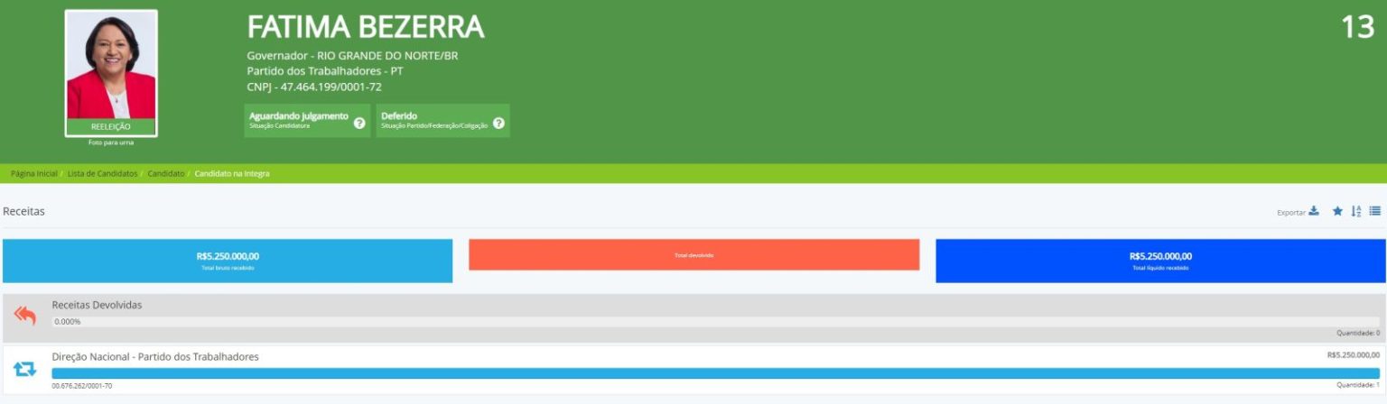 Além dela, também foram feitos repasses para a candidatura de Natalia Bonavides a deputada federal (reeleição), no valor de R$ 1 milhão; e a candidatura de Fernando Mineiro, ex-secretário de gestão de Projetos, e que também disputa uma cadeira na Câmara dos Deputados – ele recebeu R$ 455 mil.