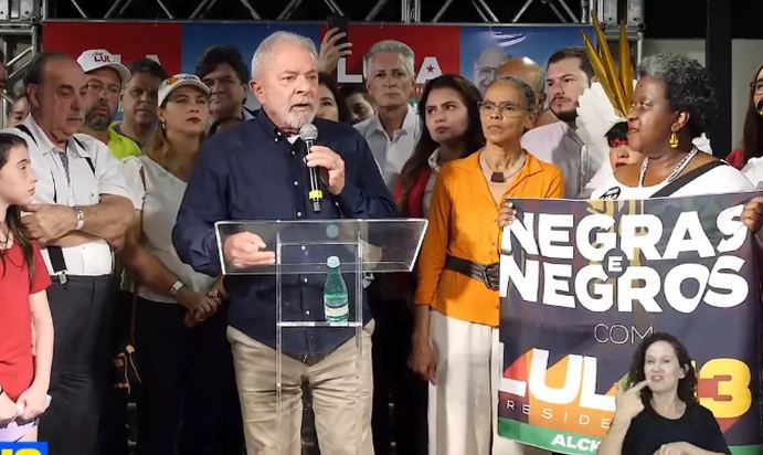 A entrevista coletiva do candidato à presidência pelo PT, Luiz Inácio Lula da Silva na cidade de Ribeirão das Neves (MG) foi ao lado da senadora Simone Tebet (PMDB) e da deputada federal eleita, Marina Silva.