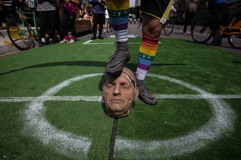 “Vamos chutar a cabeça desse verme”, dizia uma mulher, apontando para a bola com o rosto de Bolsonaro, que era jogada de um lado para o outro. “Venham, pessoal, é gostoso demais. É terapêutico.”