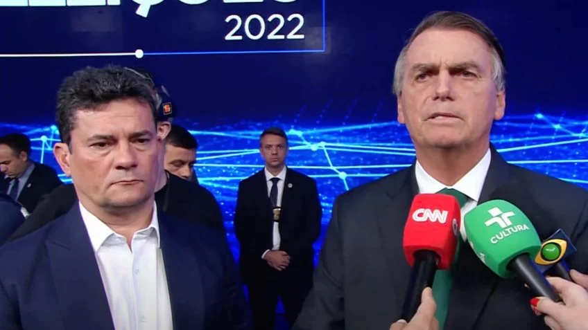 Moro estava ao lado do presidente e candidato à reeleição, Jair Bolsonaro (PL), depois do debate presidencial realizado neste domingo (16.out.2022).