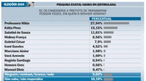 Chama atenção na pesquisa a queda considerável de quem estava entre os três da ponta ao comparar com a última amostra da Exatus, realizada no dia 2 de junho. Nilda liderava com 33,36% (hoje caiu para 27,94%), Kátia Pires saiu de 21,83% para 15,15% e Salatiel, que estava com 12,99%, agora com 11,01%. E nesse cenário, Wolney tinha 5,03%, agora tem 8,56%, um crescimento superior a 70%.